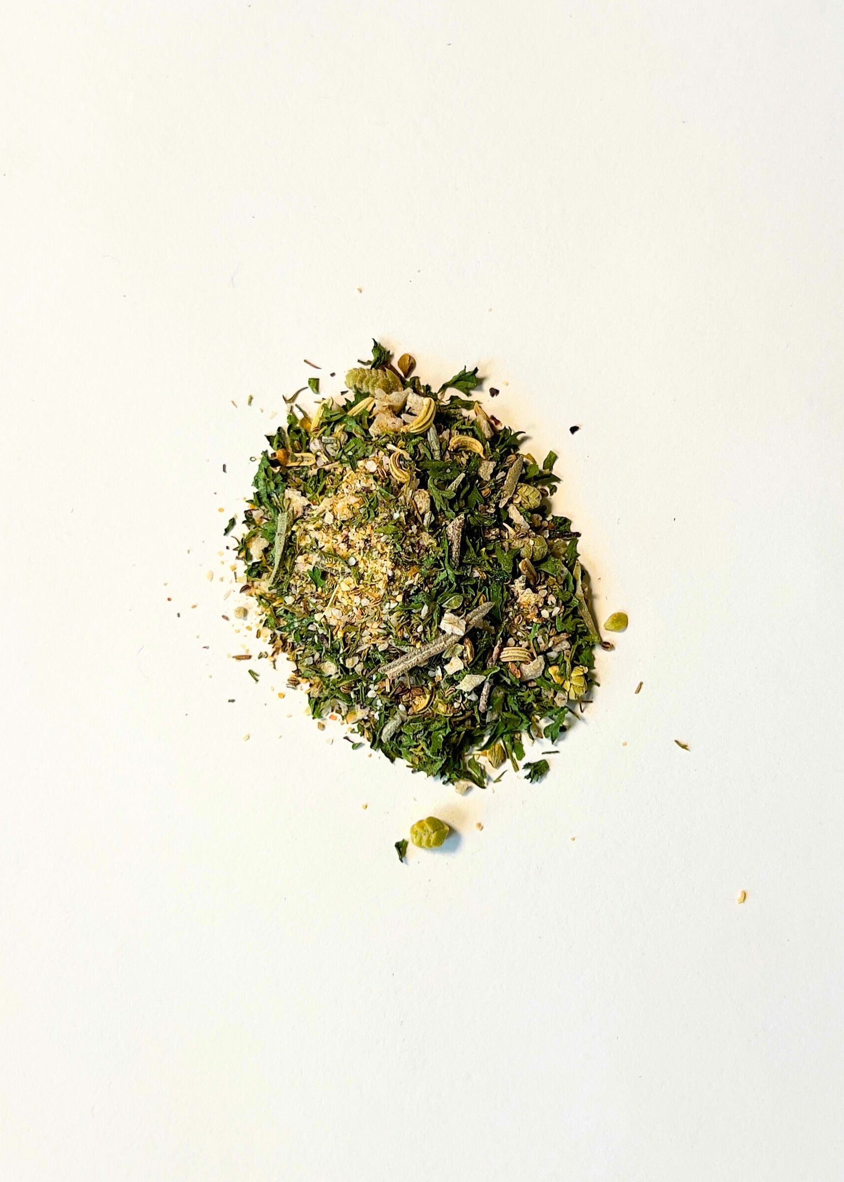 All hail Herby Spice - she’s lean, she’s green, she’s an all around pantry dream. A blend of the finest herbs and seeds - parsley, dill, rosemary, oregano, fennel, celery, and flowering thyme - plus delicate flake salt, slowly dried and shaved purple shallot, black pepper, and a touch of lemon peel, she’s a kitchen workhorse with unlimited applications, here to liven up any culinary creation.